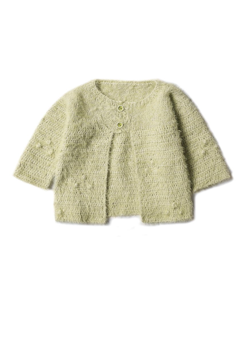 Lana Grossa Per Fortuna (74 % Baumwolle (Bio), 26% Polyamid, Lauflänge = 190 m/50 g): 100 (150) g Resedagrün (Fb 14); Rundstricknadel Nr. 3; Häkelnadel Nr. 3; zwei Knöpfe mit 13 mm Ø.