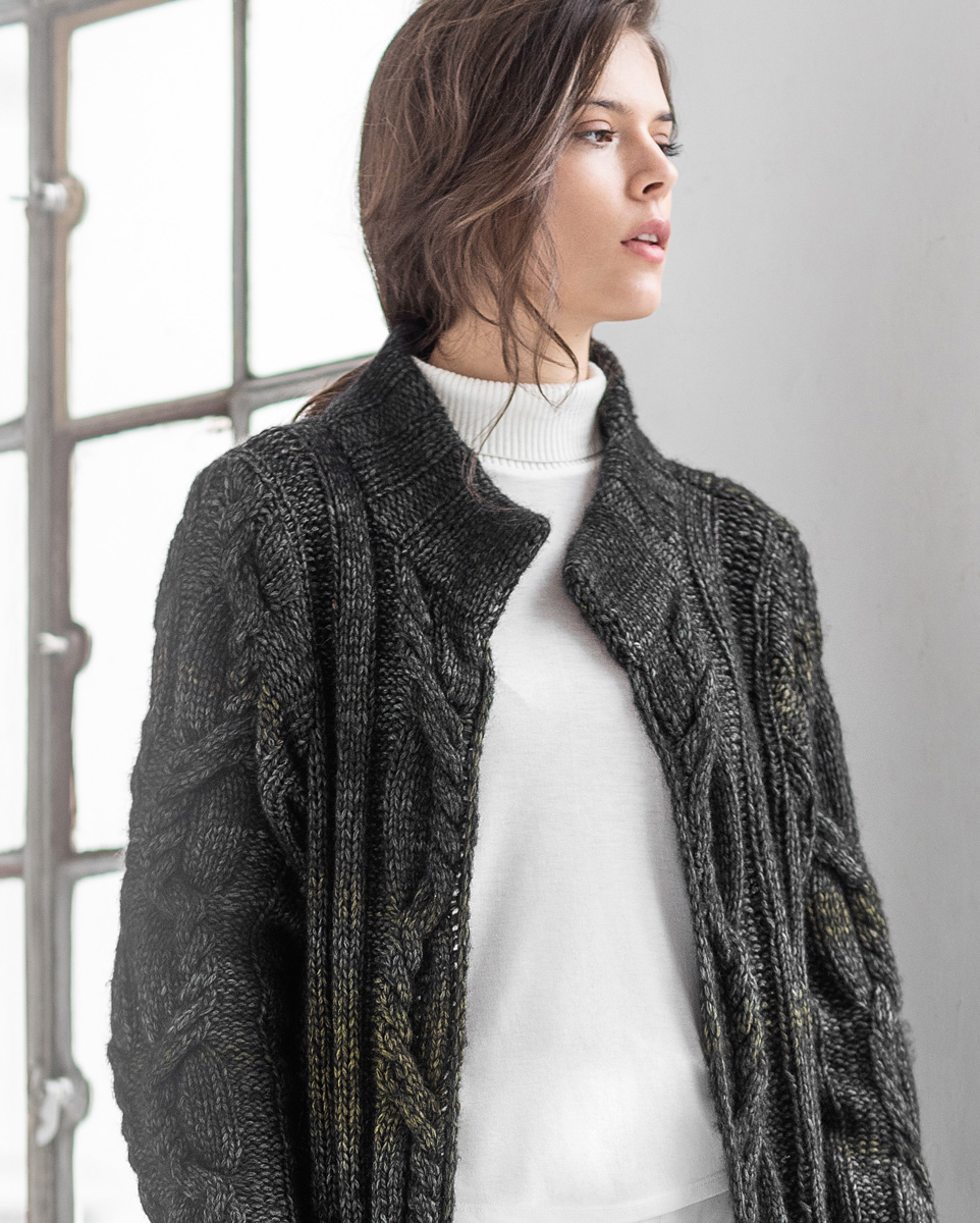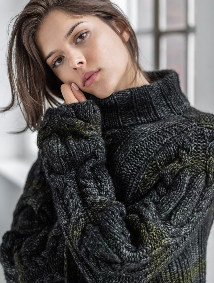 Lana Grossa Piuma (75 % Schurwolle, 15 % Alpaka, 10 % Polyamid, Lauflänge 140 m/50 g) 500 (550 – 600) g Oliv/Graugrün/Schwarz (Fb 3); Stricknadeln Nr. 7, eine 40 cm lange Rundstricknadel Nr. 7, eine Häkelnadel Nr. 6.