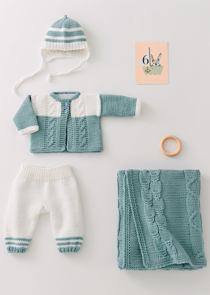 Lana Grossa Riserva (70 % Baumwolle, 30 % Polyamid, Lauflänge 125 m/50 g) 50 g Mint (Fb 6) und 50 g Weiß (Fb 1); Stricknadeln Nr. 4, eine 40 cm lange Rundstricknadel Nr. 4; zwei Knöpfe mit 13 mm Ø.
