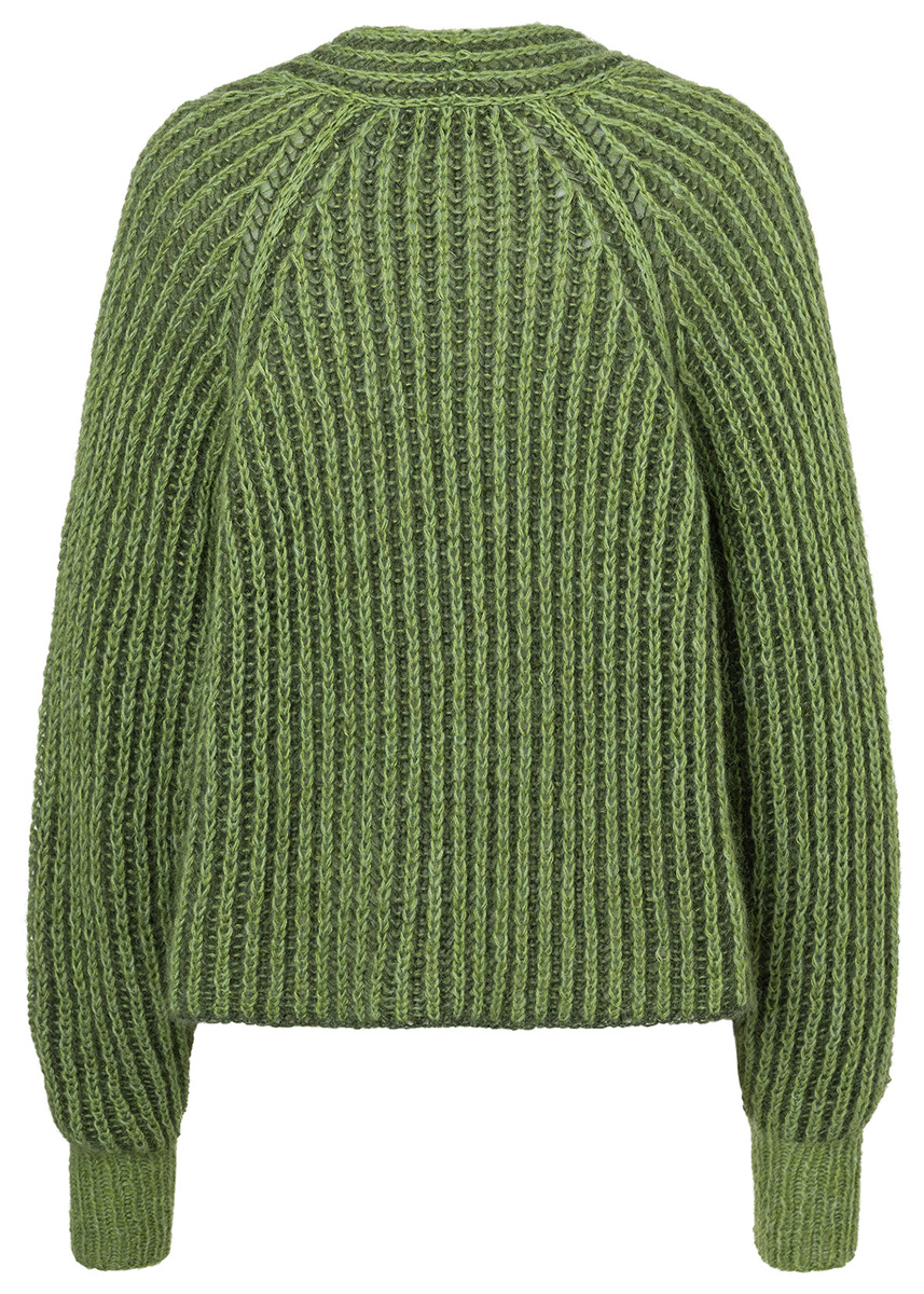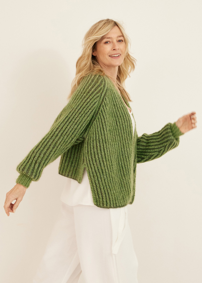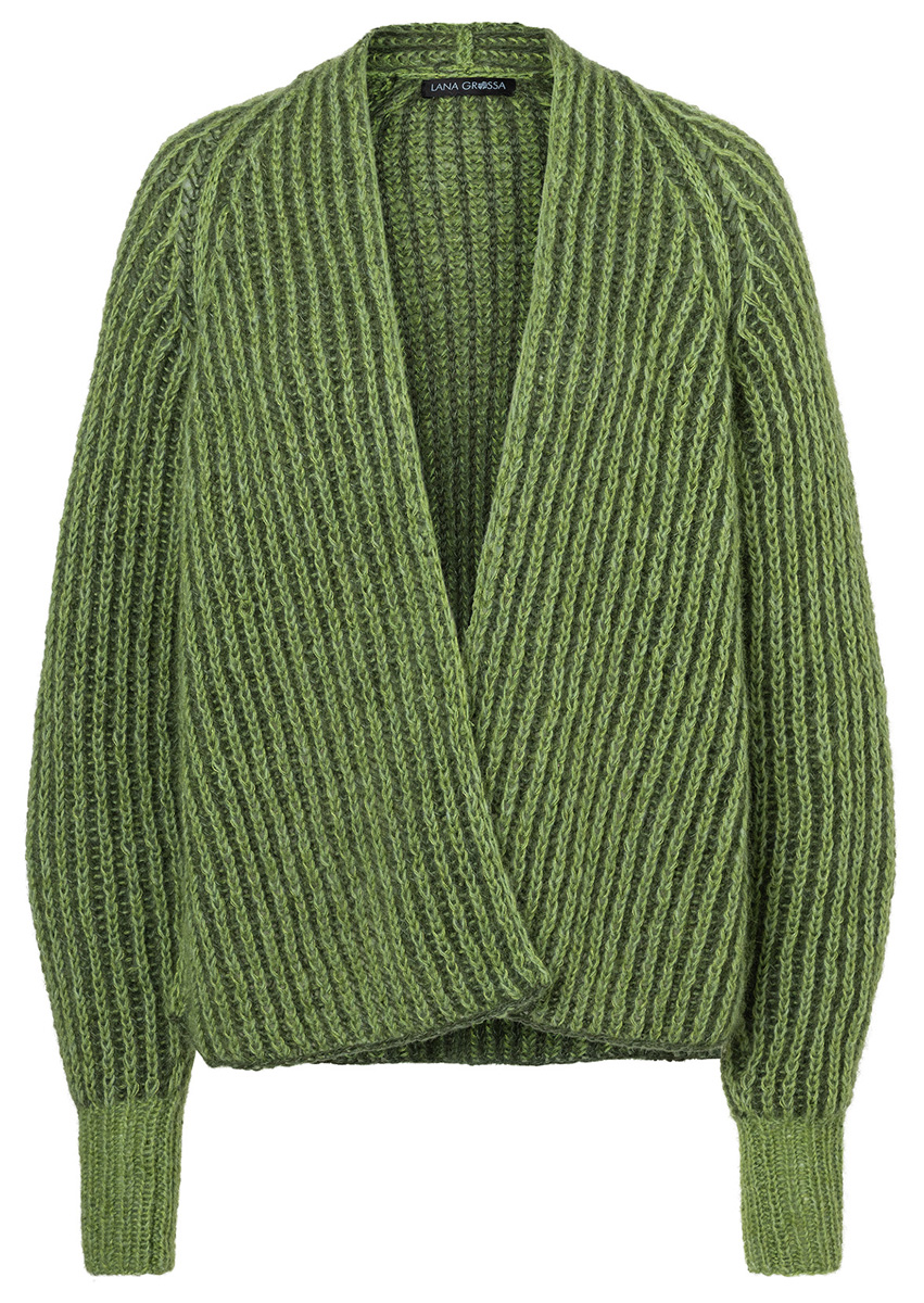 Lana Grossa Silkhair (70% Mohair, 30% Seide, Lauflänge 210 m/25 g), 75 (100 – 100) g Blattgrün (Fb 167) und 75 (100 – 100) g Moosgrün (Fb 127) und Lana Grossa Ecopuno (72% Baumwolle, 17% Schurwolle Merino, 11% Baby Alpaca, Lauflänge 215 m/50 g), 150 (200 – 200) g Hellgrün (Fb 20) und 150 (200 – 200) g Loden (Fb 1); je 1 Rundstricknadel Nr. 4,5 und 5, 1 Häkelnadel Nr. 4.
