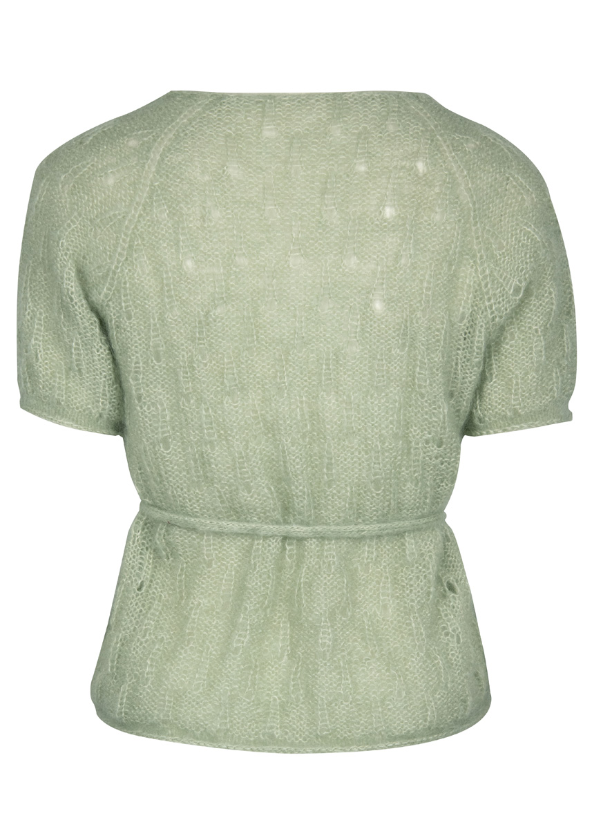 Lana Grossa Silkhair (70% Mohair, 30% Seide, Lauflänge 210 m/25 g), 175 (200 – 225) g Weißgrün (Fb 140); Stricknadeln Nr. 4 und 5, 1 Rundstricknadel Nr. 5, 80 cm lang, 1 Häkelnadel Nr. 3,5, 2 Nadeln eines Nadelspiels Nr. 3,5.