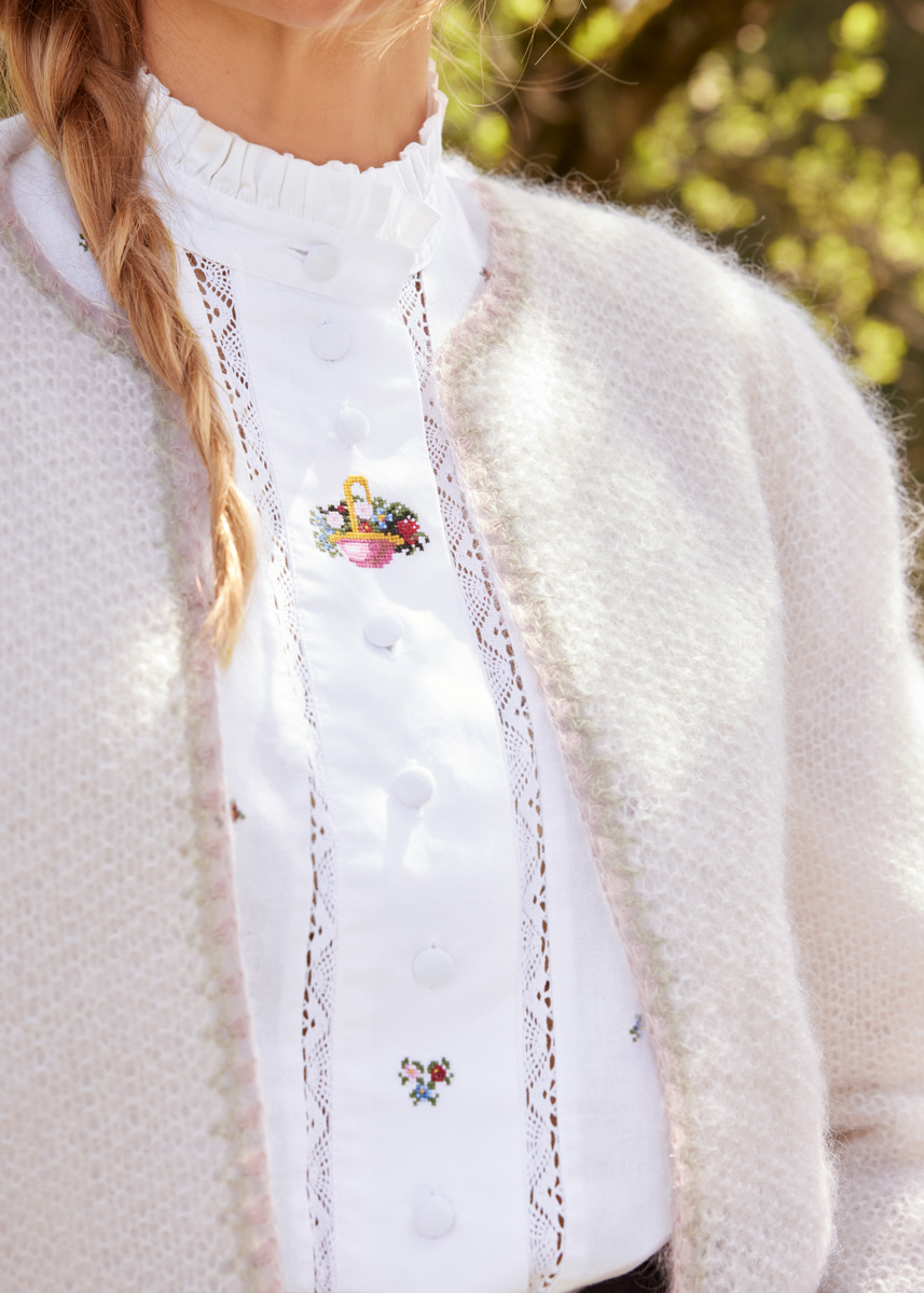 Das weiße Perlmuster-Jäckchen besteht aus einem flauschigen Mohair-Seidengemisch und hat romantische Keulenärmel. Hübscher Abschluss: die Häkelbordüre in Pudertönen.