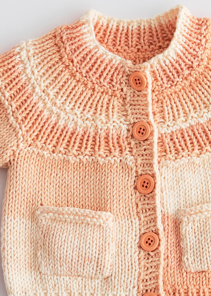 Lana Grossa Soft Cotton Dégradé (70 % Baumwolle, 30 % Microfaser, Lauflänge 140 m/50 g) 100 (100/150/150) g Ecru/Rosé/ Lachs (Fb 102); Stricknadeln Nr. 3,5 und 4, je eine 40 cm lange Rundstricknadel Nr. 3,5 und 4, fünf Knöpfe mit 14 mm Ø.