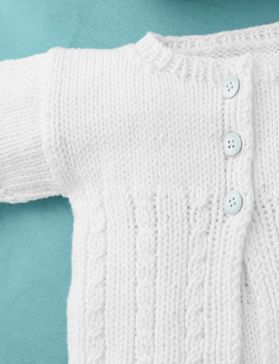 Lana Grossa Soft Cotton (70 % Baumwolle, 30 % Polyamid, Lauflänge 140 m/50 g) 100 g Weiß (Fb 10); Stricknadeln Nr. 3,5, eine 40 cm lange Rundstricknadel Nr. 3,5; drei Knöpfe mit 12 mm Ø.