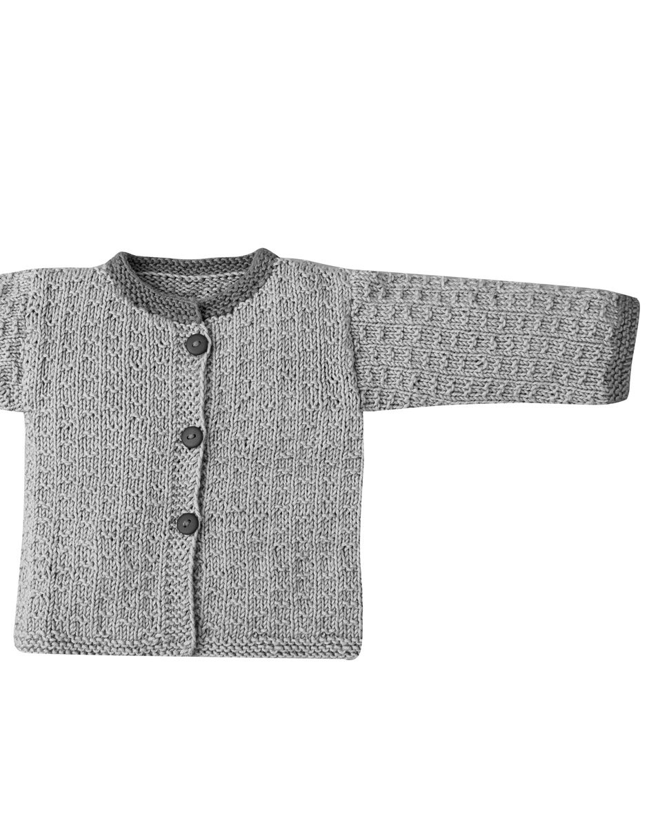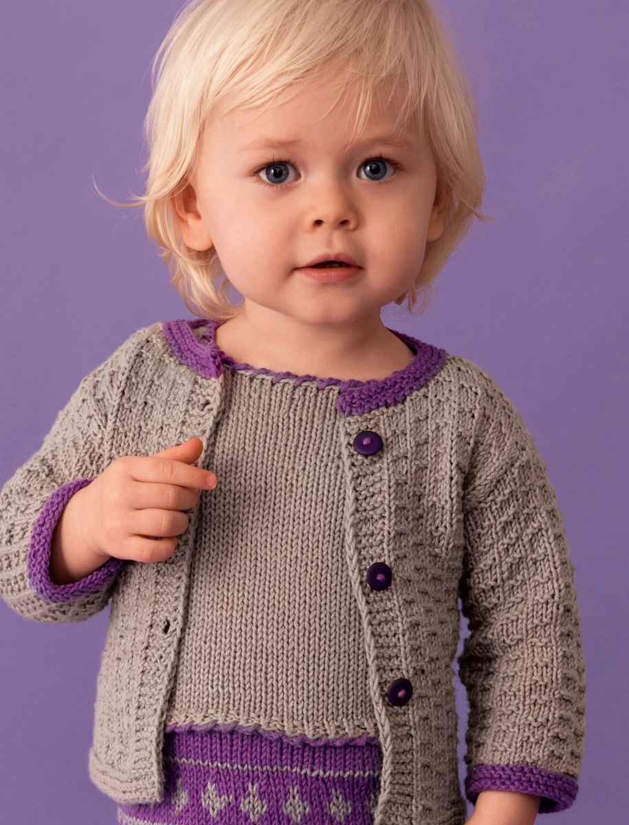 Lana Grossa Soft Cotton (70 % Baumwolle, 30 % Microfaser, Lauflänge 140 m/50 g) 100 (150/150) g Grüngrau (Fb 4) und 50 g Violett (Fb 15); Stricknadeln Nr. 3,5, eine 40 cm lange Rundstricknadel Nr. 3,5; drei Knöpfe mit 15 mm Durchmesser.