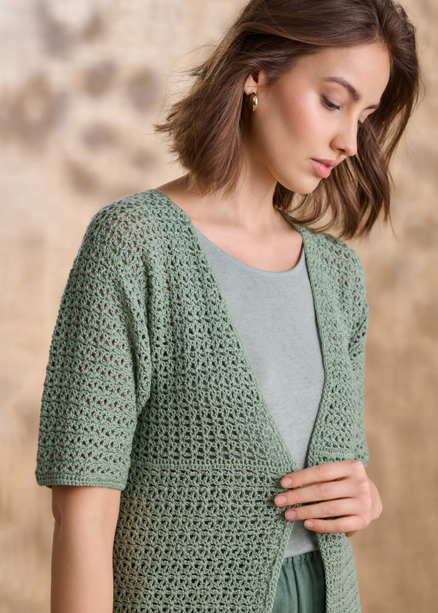 Lana Grossa Summer Cashmere (90% Baumwolle, 10% Kaschmir, Lauflänge 210 m/50 g), 300 (350 – 400) g Resedagrün (Fb. 23); 1 Häkelnadel Nr. 3 und 3,5.