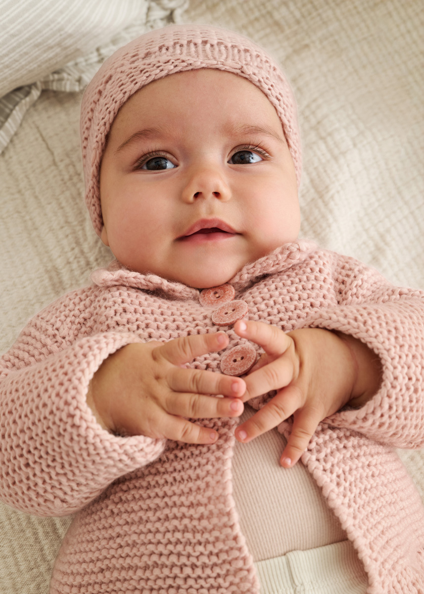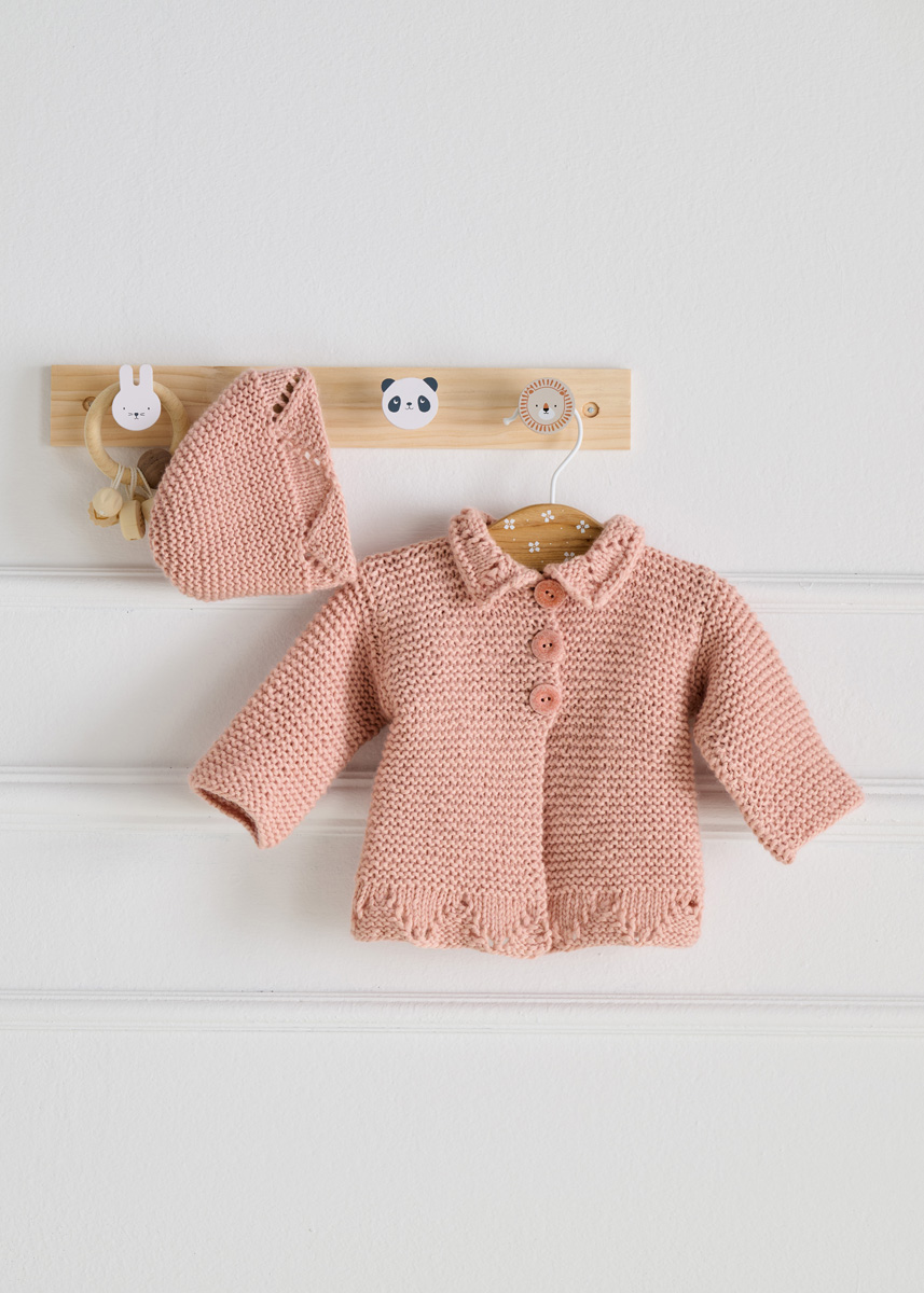 Lana Grossa Summer Softness (80% Baumwolle (Bio), 20% Schurwolle (Merino superfine); LL = 130 m/50 g): 100 (100/150/200/200) g Pastellrosa (Fb. 10); zwei Rundstricknadeln 3,5 mm; eine Rundstricknadel 4 mm; 3 Knöpfe mit 20 mm Ø.