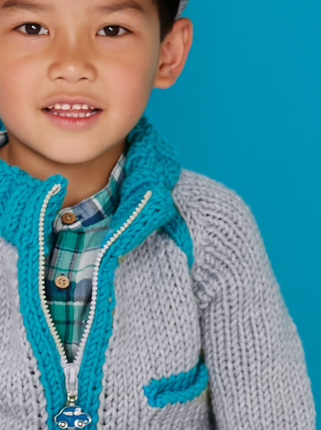 Lana Grossa Qualität „Superbingo” (100% Schurwolle, LL = 55 m/50 g), ca. 300 (350) g Hellgrau meliert (Fb 14) und ca. 150 (200) g Türkis (Fb 2), Stricknadeln Nr. 8 und 1 Reißverschluss von PRYM, S4, Fb 016, 45 cm lang, Zipper-Anhänger: Art. 482 172.