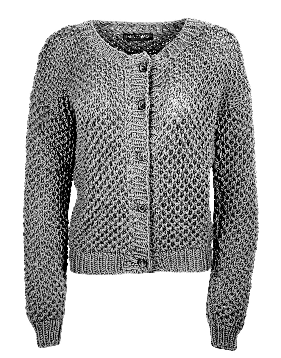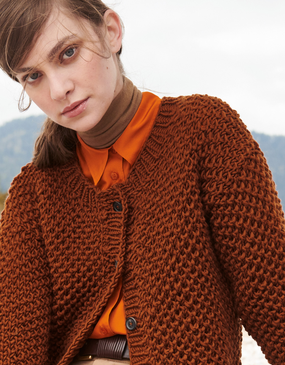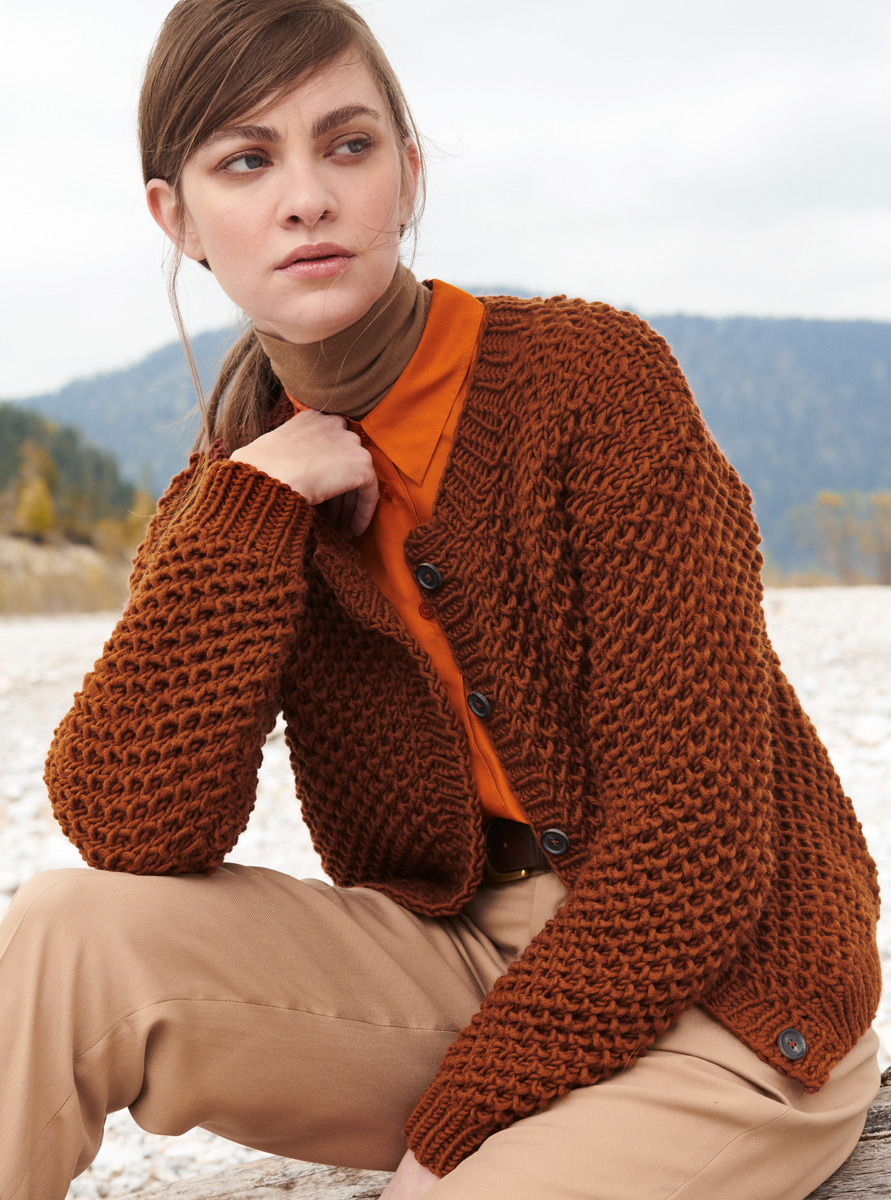 Lana Grossa Superbingo (100% Schurwolle, Lauflänge 55 m/50 g), 750 (800 – 850) g Rotbraun (Fb 48); Stricknadeln Nr. 6 und 8, 1 Rundstricknadel Nr. 6, 40 cm lang und 5 Knöpfe von UNION KNOPF, Art. 36428, Fb 80, Gr. 20 mm.