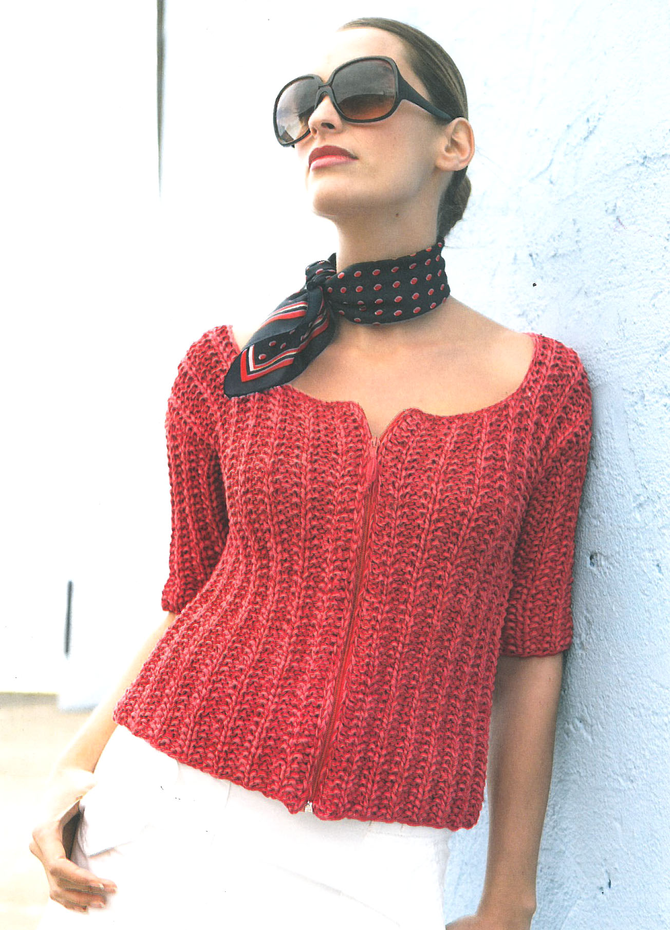 Lana Grossa "Vespa" (42% Baumwolle, 40% Polyamid, 18% Seide, LL = 90 m/50 g) 500 (600) g Rot (Fb 5). Stricknadeln Nr. 8- 9 , eine Häkelnadel Nr. 5, ein teilbarer Reißverschluss, 40 (45) cm lang.