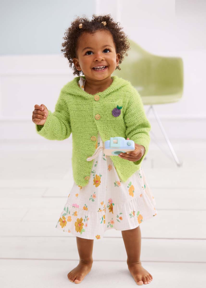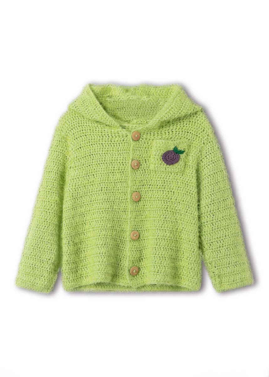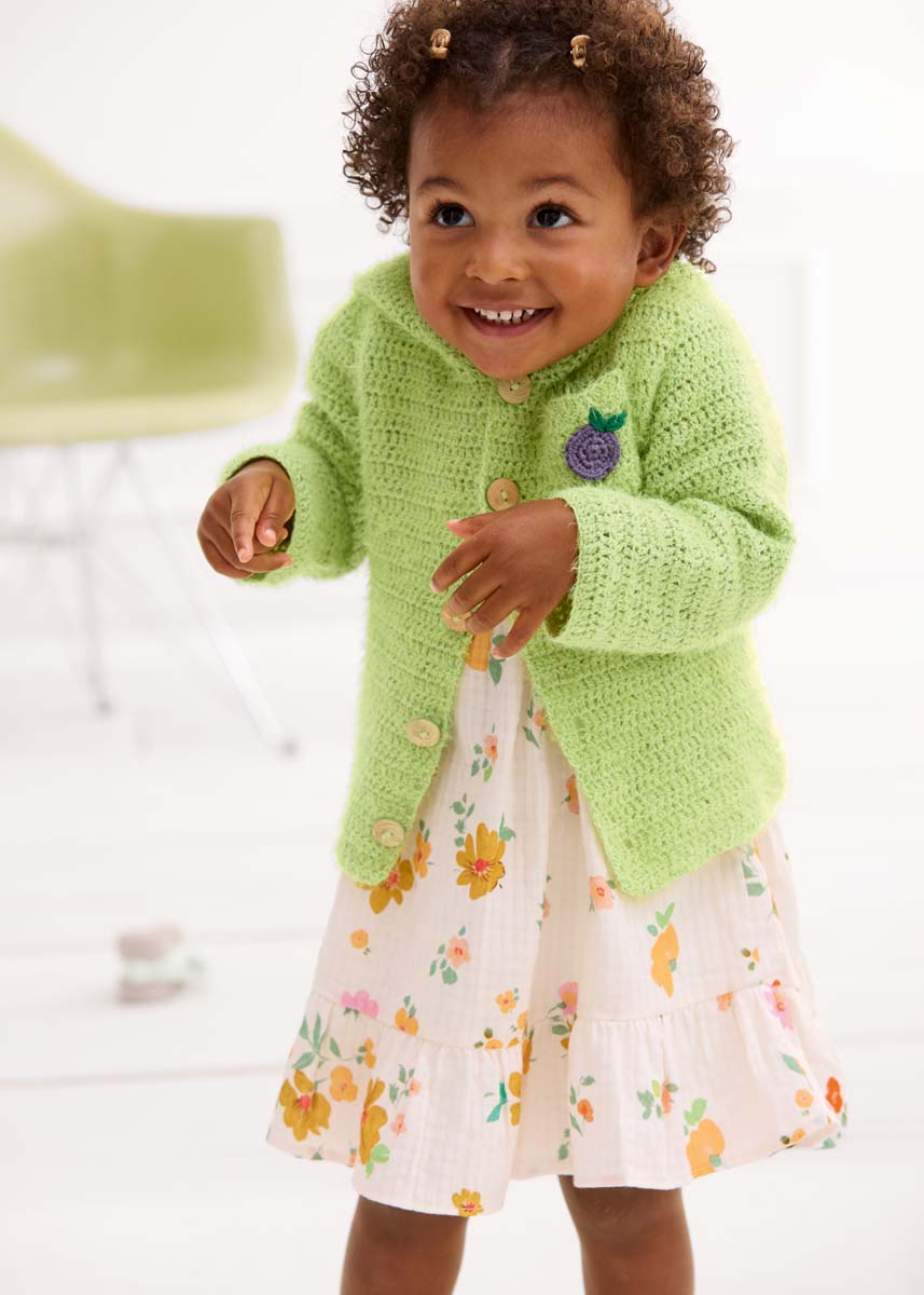Lana Grossa Per Fortuna (74 % Baumwolle, 26% Polyamid; LL = 190 m/50 g): 150 (150/200/250) g Hellgrün (Fb. 27); Lana Grossa Elastico (96% Baumwolle, 4% Polyester (elité); LL = 160 m/50 g): je 50 g Flaschengrün (Fb. 174) und Fliederlila (Fb. 164); je eine Häkelnadel 3 mm und 3,5 mm; 5 farblich passenden Knöpfe mit 18 mm Ø.