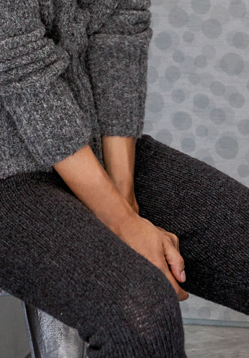 Lana Grossa-Qualität „Garzato Fleece” (70 % (Baby) Alpaka, 30 % Polyamid, LL = ca. 225 m/50 g): ca. 250 (300) g Grau/Schwarz (Fb. 10); Stricknadeln Nr. 5 und 5,5, je 1 Rundstricknadel Nr. 5 und 5,5, 80 cm lang; 4 Druckknöpfe von Prym, Art. 341253, 17 mm Ø, in Silber.