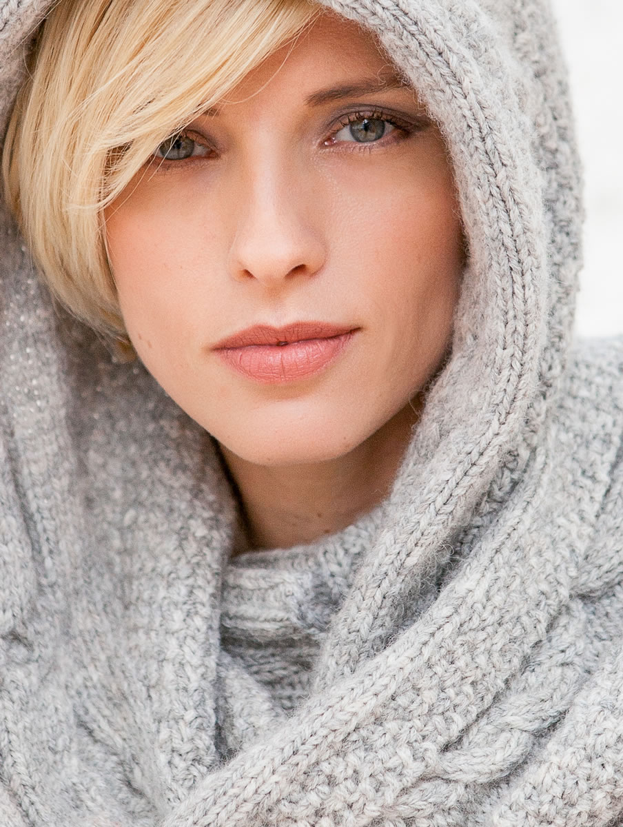 Lana Grossa „Alta Moda Alpaca” (90% Baby Alpaca, 5% Schurwolle Merino, 5% Polyamid, LL = 140 m/50 g) 300 g Taupe (Fb 15). Stricknadeln Nr. 6, eine Häkelnadel Nr. 5, 1 Fellpompon, Finnraccoon Multicolor schwarz/weiss (Fb 144).