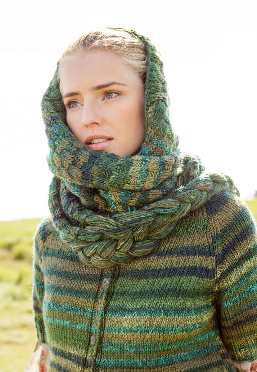 Lana Grossa-Qualität „Gomitolo Merino“ (100 % Schurwolle Merino, LL = ca. 110 m/50 g), 450 g Oliv/Moosgrün/Dunkelblau/Petrol (Fb 7). Strick-Nd Nr. 6, eine 80 cm lange Rundstrick-Nd Nr. 5, 1 Häkel-Nd Nr. 5,5. 2 Hilfs-Nd (zum M stilllegen).