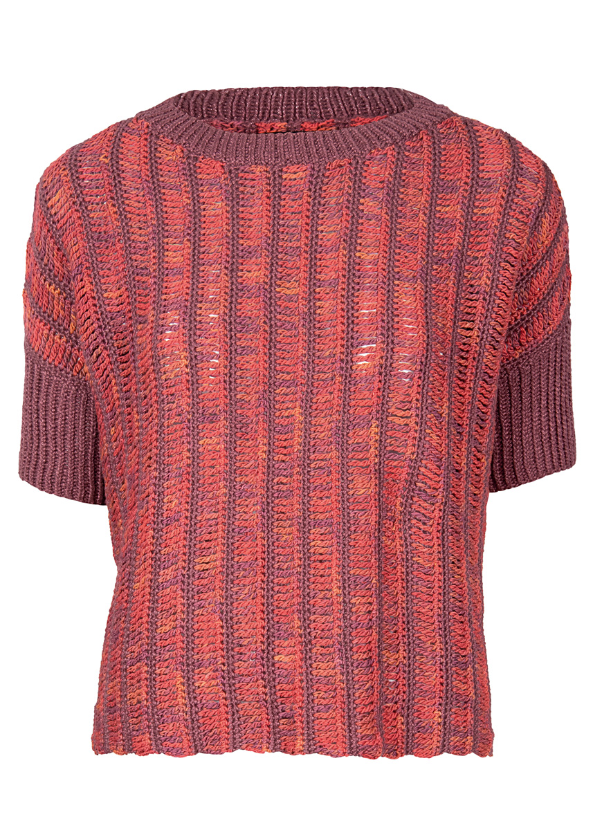 Beim Häkelpulli sorgen zweierlei Rottöne für spektakuläre Changeant-Effekte. Die Rippstrick-Bündchen wirken sportlich. Und machen das Oversized-Modell zum Styling- Allrounder, der auch super zu Jeans und Hemdbluse passt.