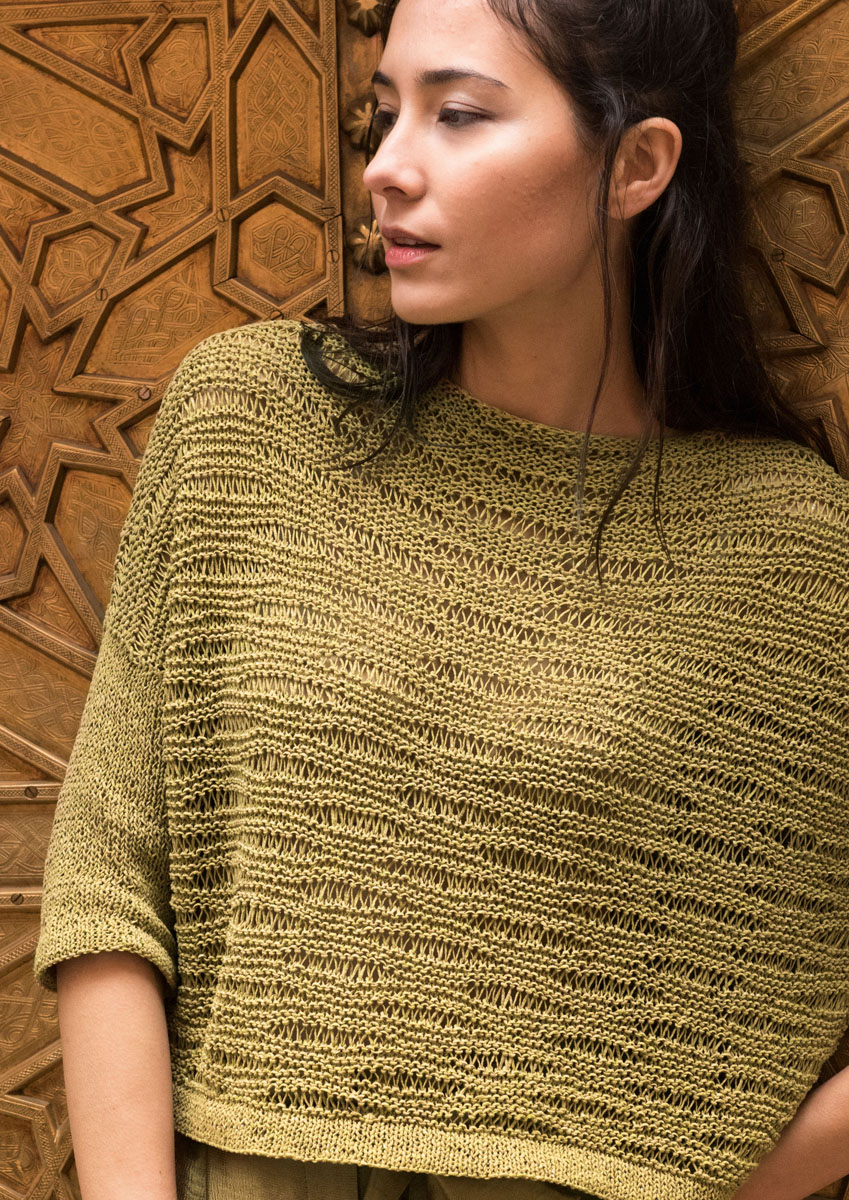 Lana Grossa-Qualität „Nizza” (74 % Baumwolle, 25 % Polyester, 1 % Polyester (metallisiert), LL = ca. 115 m/50 g): ca. 400 (450) g Camel/Gelbgrün/Gold (Fb. 14); Stricknadeln Nr. 3,5 und 4,5, 1 Rundstricknadel Nr. 4,5, 60 cm lang.