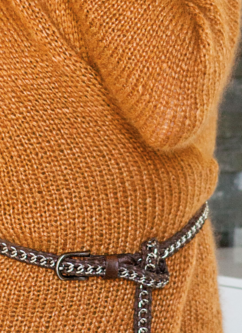 Lana Grossa-Qualität „Tiffany” (64 % (Super Kid) Mohair, 26 % Seide, 10 % Polyamid, LL = ca. 110 m/25 g): ca. 375 (400 – 425) g Goldbraun (Fb. 2); Stricknadeln Nr. 7, 1 Rundstricknadel Nr. 7, 120 cm lang.
