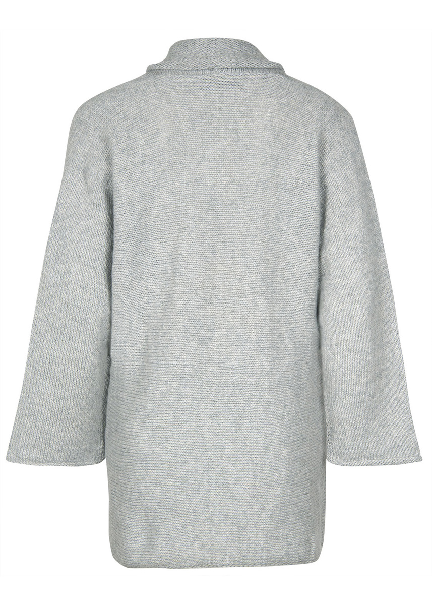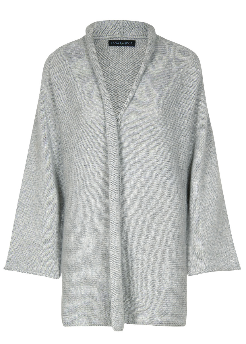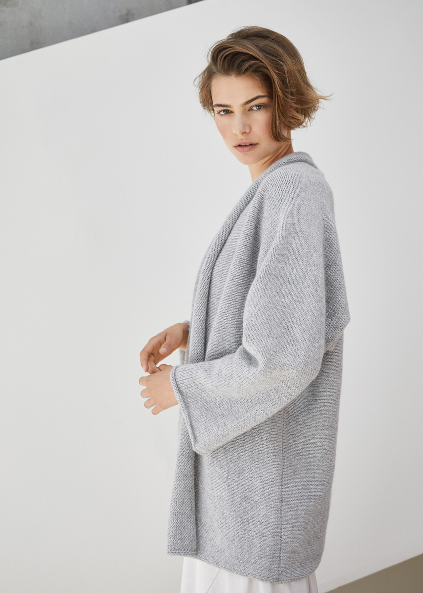 Lana Grossa Cashmere Puro (100% Kaschmir, 82 m/25 g), 450 (475 – 500 – 525) g Hellgrau (Fb 20); 1 Rundstricknadel Nr. 5, 100 cm lang.