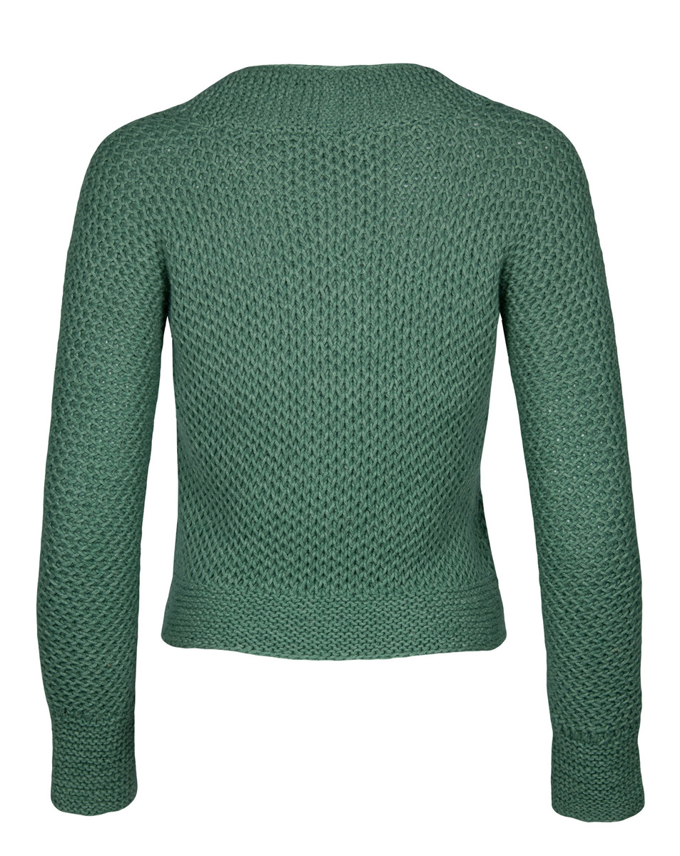 Lana Grossa-Qualität „Fourseason” (45 % Schurwolle (Merino extrafine), 40 % (Bio) Baumwolle, 15 % (rec.) Kaschmir, LL = ca. 105 m/50 g): ca. 400 (450) g Grün (Fb. 7); Stricknadeln Nr. 5,5, 1 Rundstricknadel Nr. 5,5, 100 cm lang, 1 Rundstricknadel Nr. 5, 60 cm lang,1 Wollhäkelnadel Nr. 4,5; 3 Schmuckknöpfe von Union Knopf, Art. 453059, Fb. 7882 schwarzbraun, ø 20 mm.