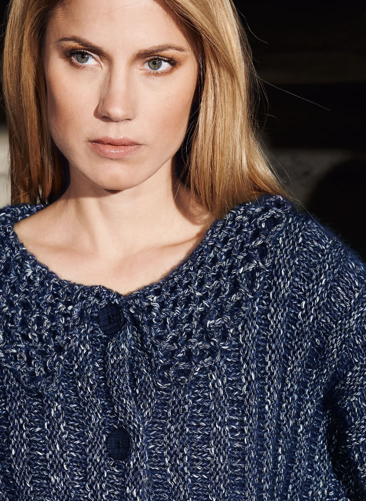 Lana Grossa-Qualität „Marmo” (51 % Baumwolle, 27 % Schurwolle (Merino), 22 % Polyamid, LL = ca. 90 m/50 g): ca. 400 (450) g Marine/Rohweiß/Anthrazit (Fb. 11); Stricknadeln Nr. 7, 1 Rundstricknadel Nr. 7, 80 cm lang, 1 Wollhäkelnadel Nr. 5; 3 Knöpfe von Union Knopf, Art. 451502, 28 mm ø, Fb. 68 dunkelblau.