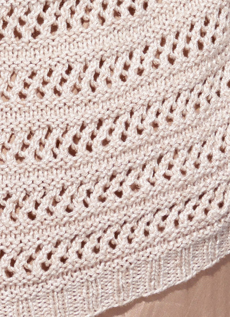 Lana Grossa-Qualität „Linarte” (40 % Viskose, 30 % Baumwolle, 20 % Leinen, 10 % Polyamid, LL = ca. 125 m/50 g): ca. 400 (450 – 500) g Beige (Fb. 62); Stricknadeln Nr. 3,5 und 4,5, 1 Rundstricknadel Nr. 4,5, 80 cm lang, 1 Rundstricknadel Nr. 3,5, 60 cm lang.