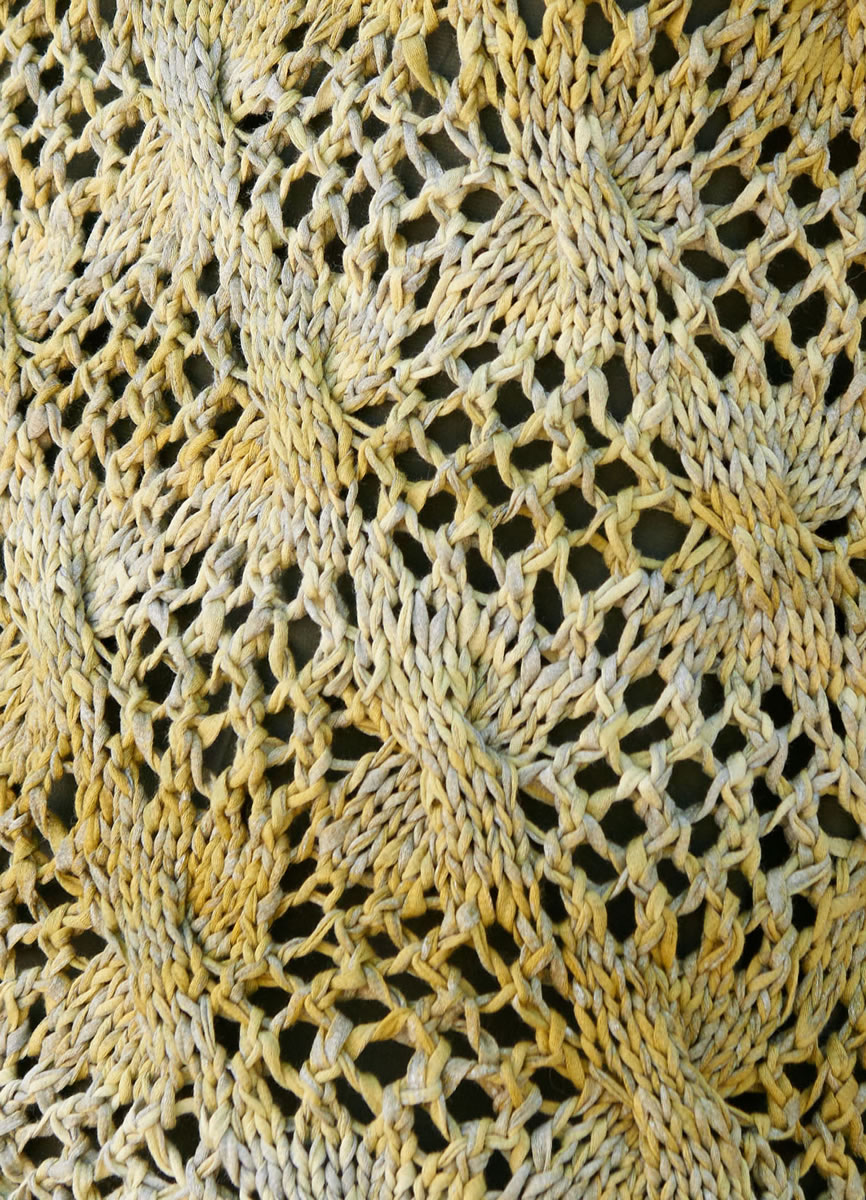 Lana Grossa-Qualität „Roma Degradè” (100 % Baumwolle, LL = ca. 105 m/50 g): ca. 350 (400) g Limette/Senfgelb/Silber (Fb. 108); Stricknadeln Nr. 5,5, 1 Rundstricknadel Nr. 5, 60 cm lang, 1 Wollhäkelnadel Nr. 5.