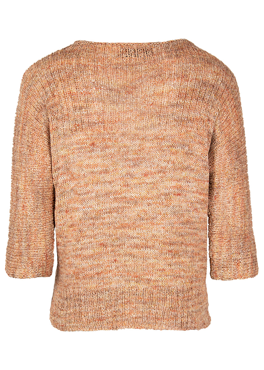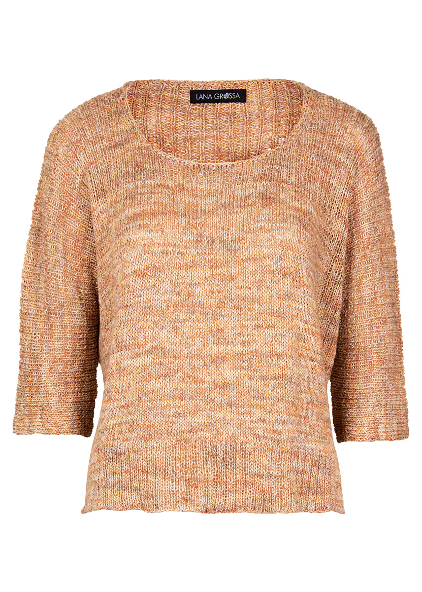 Lana Grossa-Qualität „Landlust Sommerseide Mélange” (50 % Seide, 50 % Baumwolle, LL = ca. 170 m/50 g): ca. 300 (350 – 400) g Orange meliert (Fb. 101); Stricknadeln Nr. 3,5, je 1 Rundstricknadel Nr. 3,5, 60 und 100 cm lang.