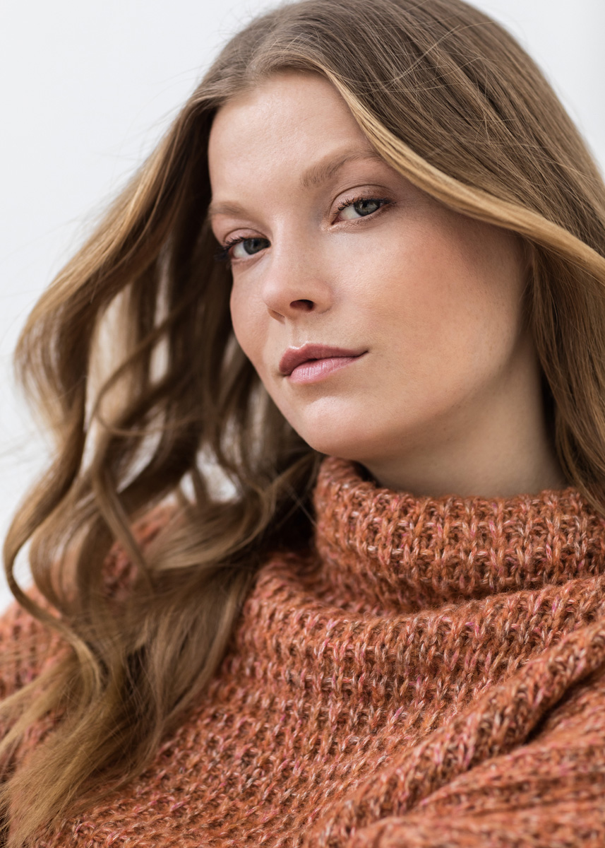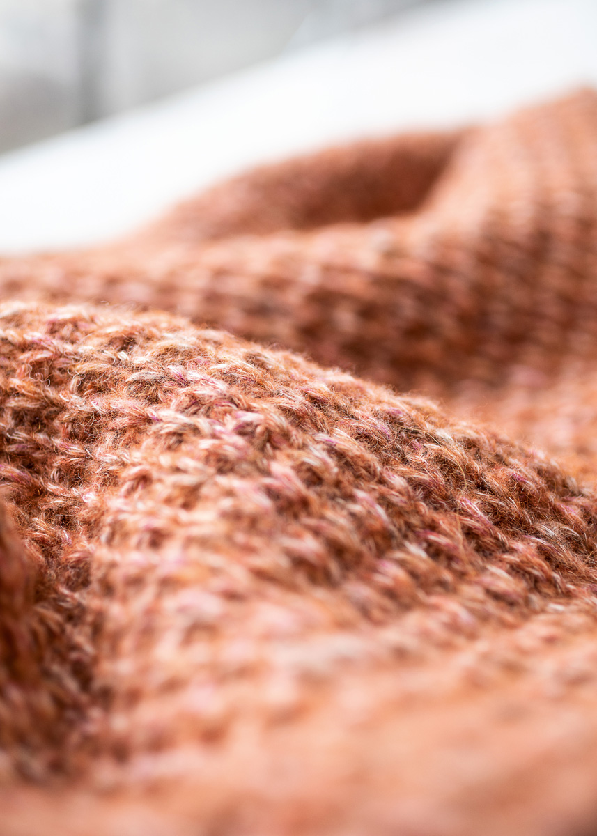 Lana Grossa-Qualität „Sara” (65 % Baumwolle, 30 % (Baby) Alpaka, 5 % Schurwolle (Merino), LL = ca. 125 m/50 g): ca. 350 (400) g Rost meliert (Fb. 3); Stricknadeln Nr. 5,5, je 1 Rundstricknadel Nr. 5,5, 40 und 80 cm lang.