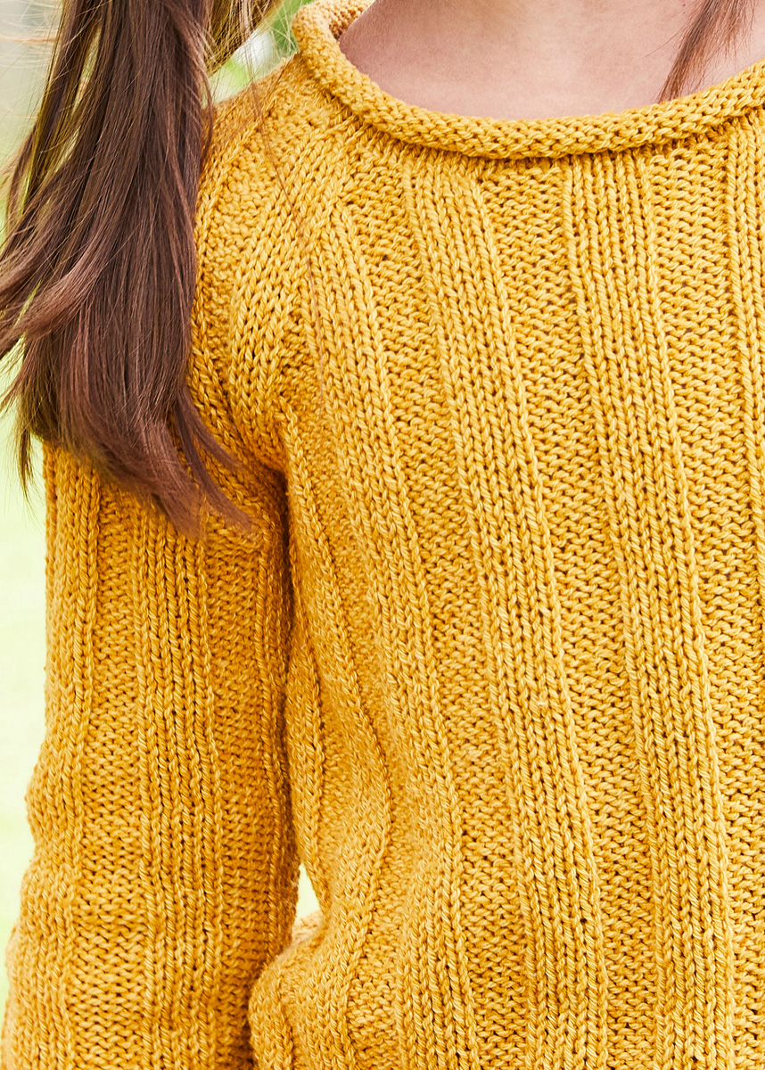 Lana Grossa-Qualität „Landlust- Sommerseide“ (50% Seide, 50% Baumwolle, LL ca. 170 m/50 g), 200 (200 - 250) g in Goldgelb (Fb 18); Stricknadeln Nr. 3,5 und Nr. 4, 1 Rundstricknadel Nr. 3,5, 40 cm lang.