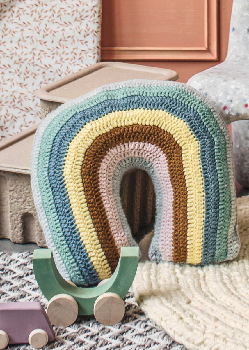 Der weiche, bunt gestreifte Häkelbezug beschert dem Regenbogenkissen einen fantasievollen Anstrich. Er besteht aus zwei zusammengenähten Teilen, Zunahmen sorgen für die Rundungen.