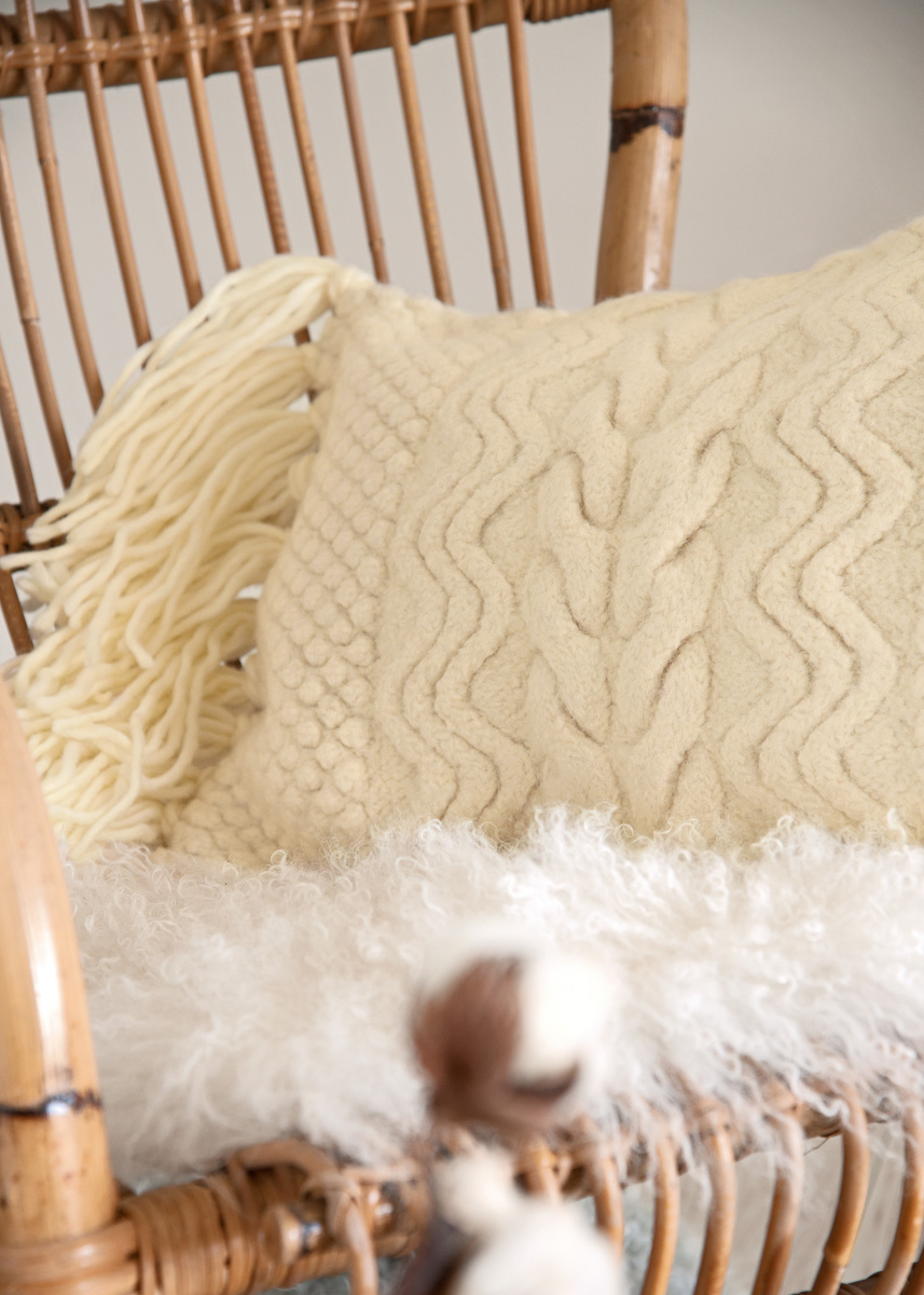 Lana Grossa Feltro (100% Schurwolle, Lauflänge 50 m/50 g), 850 g Rohweiß (Fb 1); 1 Stricknadeln Nr. 8, 1 Häkelnadel Nr. 6, 1 Kissenfüllung 60 x 40 cm.