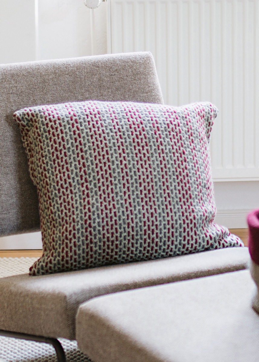 Lana Grossa-Qualität „Cool Merino“ (90 % Schurwolle (Merino), 10 % Polyamid, LL = ca 150 m/50 g): ca 300 g Hellgrau (Fb 13), je 50 g Dunkelrot (Fb 1) und Dunkelgrau (Fb 12); Häkelnadel Nr 4; 1 waschbares Kissen-Inlay 50 x 50 cm.
