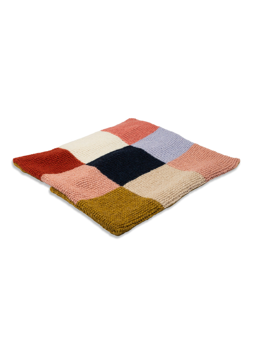 Lana Grossa- Qualität „Brigitte No. 2” (47 % (Baby) Alpaka, 45 % Baumwolle, 8 % Schurwolle (Merino), LL = ca. 140 m/50 g): ca. 100 g Senfgelb (Fb. 67) und je ca. 50 g Nachtblau (Fb. 5), Rohweiß (Fb. 16), Lachs (Fb. 46), Hellbeige (Fb. 47), Pfirsich (Fb. 55), Rost (Fb. 59) und Zartlila (Fb. 78); Stricknadeln Nr. 6; 1 waschbare Kissenfüllung, 50 x 50 cm.