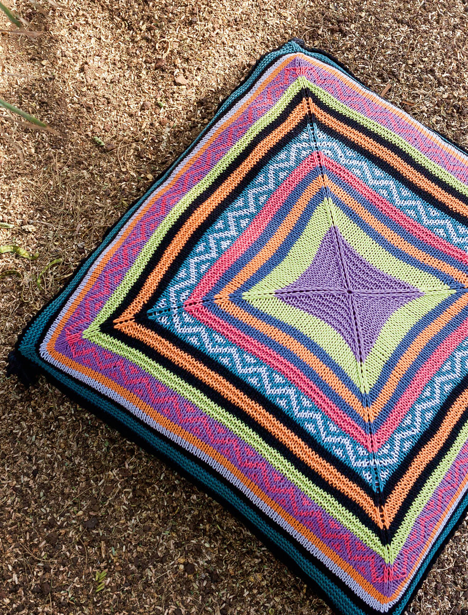 Lana Grossa-Qualität „Organico” (100 % Bio Baumwolle, LL = ca. 90 m/50 g): ca. 350 g Schwarz (Fb. 14), ca. 100 g Dunkelpetrol (Fb. 79), je ca. 50 g Violett (Fb. 97), Fliederblau (Fb. 96), Orange (Fb. 99), Nachtblau (Fb. 13), Gelbgrün (Fb. 91) und Himbeer (Fb. 69) und Lana Grossa-Qualität „Alcanto” (70 % Polyester, 30 % Polyamid, LL = ca. 125 m/50 g): ca. 50 g Schwarz (Fb. 11); Spielstricknadeln Nr. 4,5; je 1 Rundstricknadel Nr. 4,5, 40, 60, 80 und 120 cm lang, 1 Wollhäkelnadel Nr. 4; 1 waschbare Kissenfüllung, 65 x 65 cm.