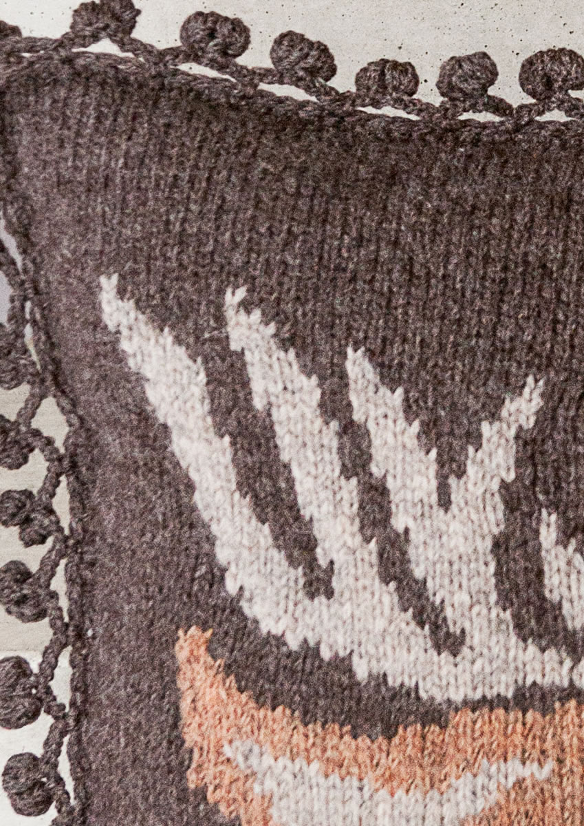Lana Grossa-Qualität „Alta Moda Alpaca” (90 % (Baby) Alpaka, 5 % Schurwolle (Merino), 5 % Polyamid, LL = ca. 140 m/50 g): ca. 250 g Graubraun (Fb. 10) und je ca. 50 g Rotbraun/Beige meliert (Fb. 29) und Taupe (Fb. 15), 1 Rest dünnes schwarzes Garn zum Aufsticken von Nasenlöchern und Augen; Stricknadeln Nr. 5,5, 1 Wollhäkelnadel Nr. 4; 1 Wollsticknadel; 1 waschbare Kissenfüllung, 50 x 50 cm.