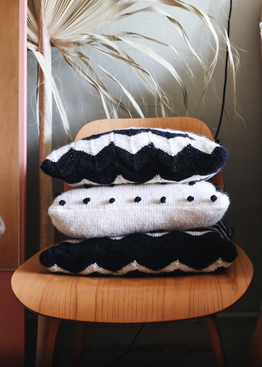 Aufgehäkelte Noppen und lebhafte Muster lassen die Kissen in sachlichem Schwarz- Rohweiß überraschend verspielt erscheinen. Alle sind 40 x 40 Zentimeter groß. Die aufwändig wirkenden Zacken- Dessins entstehen durch ein relativ simples Streifenmuster und gleichmäßige Ab- und Zunahmen.
