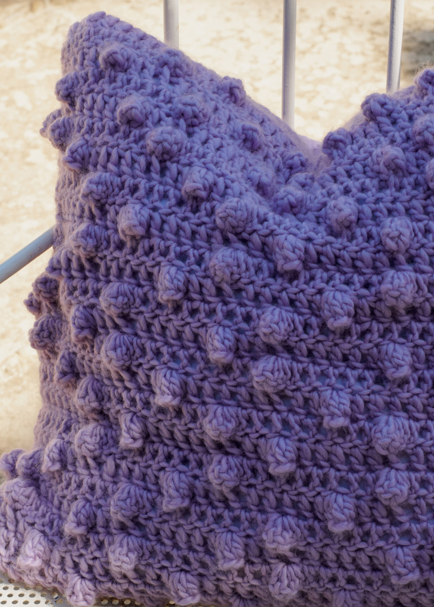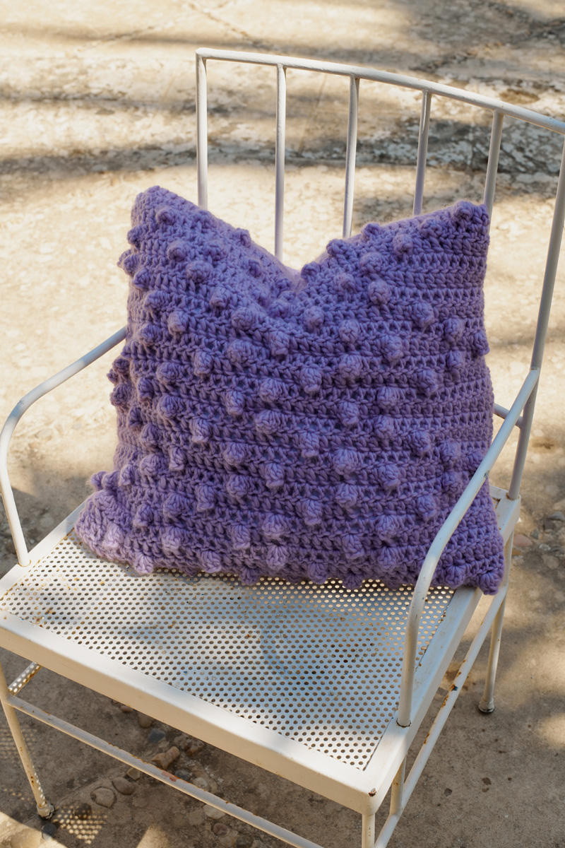 Hier verpasst frisches Lila Großmutters genopptem Häkelkissen einen zeitgemäßen Look. Das Modell misst 50 x 50 Zentimeter und hat eine schlichte Rückseite mit praktischem Hotelverschluss.
