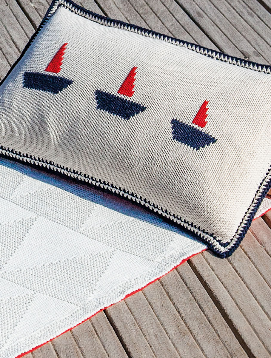 Lana Grossa-Qualität „Organico” (100 % (Bio) Baumwolle, LL = ca. 90 m/50 g): ca. 200 g Ecru (fb. 6), ca. 150 g Rot (fb. 58) und ca. 100 g Nachtblau (fb. 13); Stricknadeln Nr. 4,5, 1 Wollhäkelnadel Nr. 4,5, 1 stumpfe Sticknadel; 1 waschbare Kissenfüllung, 40 x 60 cm.
