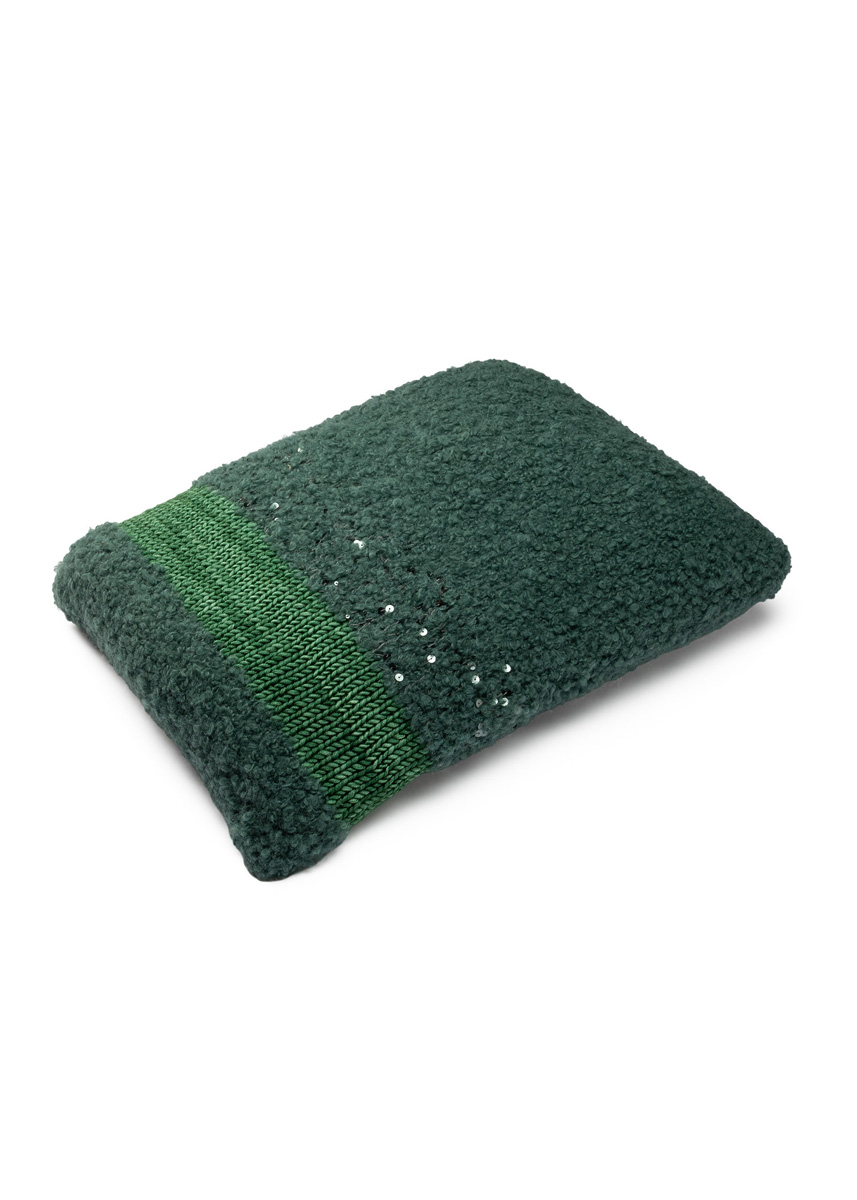 Lana Grossa-Qualität „Orsetto” (60 % Schurwolle (Merino), 40 % Alpaka (superfine), LL = ca. 75 m/50 g): ca. 150 g Petrolgrün (Fb. 9), Lana Grossa-Qualität „Cosmo” (100 % Baumwolle (plus Pailletten), LL = ca. 260 m/100 g): ca. 100 g Grau (Fb. 3) und Lana Grossa-Qualität „Vintage Superchunky” (100 % home 68 MODELL 29 Schurwolle (Merino), LL = ca. 80 m/100 g): ca. 100 g Opalgrün (Fb. 518); Stricknadeln Nr. 6; 1 waschbare Kissenfüllung, 40 x 60 cm.