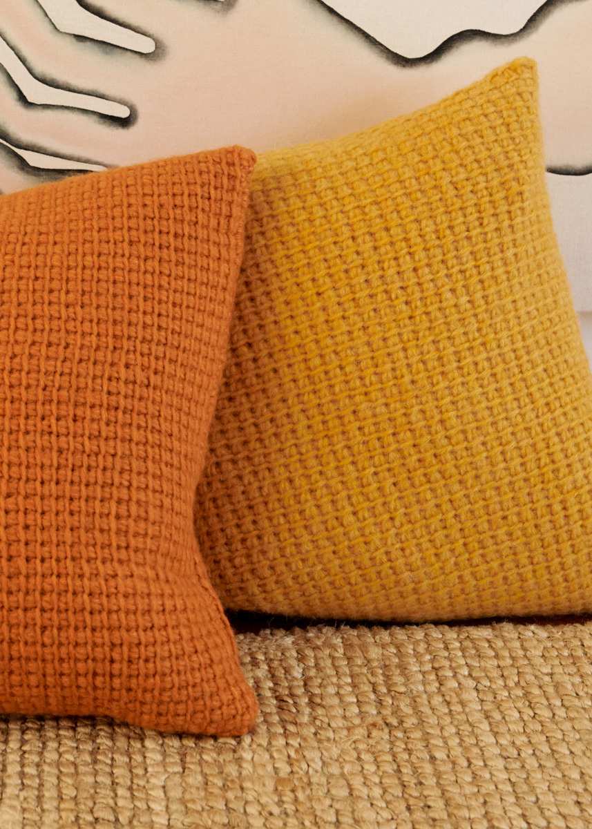 Lana Grossa-Qualität „Ecopuno Chunky” (48 % Baumwolle, 33 % Schurwolle (Merino extrafine), 19 % (Baby) Alpaka, LL = ca. 70 m/50 g): ca. 300 g Rohweiß (Fb. 111), Rost (Fb. 115) oder Gelb (Fb. 116); 1 tunesische Häkelnadel Nr. 8; waschbare Kissenfüllung, 40 x 40 cm.