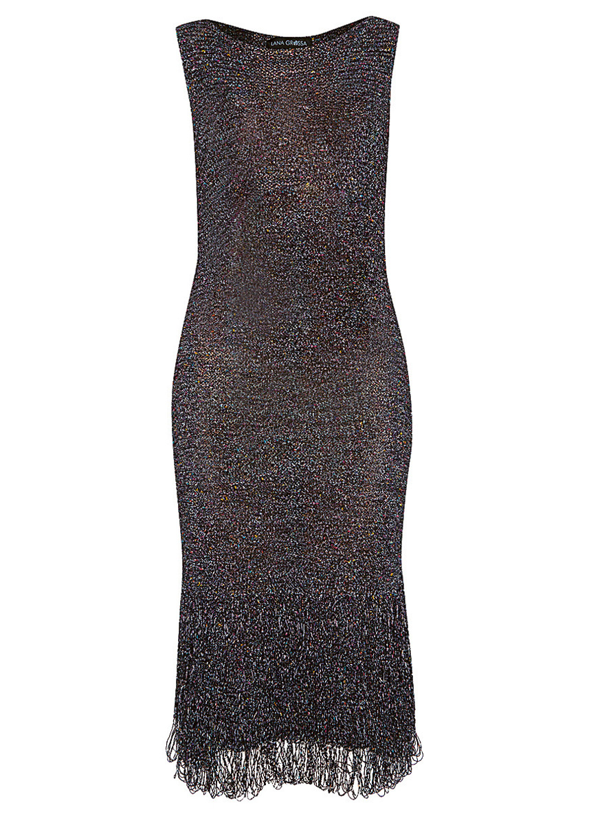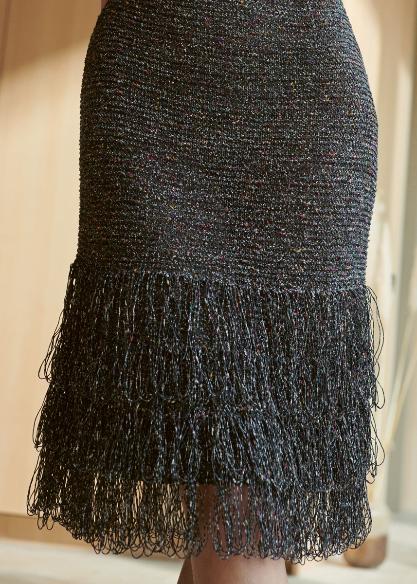 Lana Grossa-Qualität „About Berlin Spotty“ (55 % Baumwolle, 26 % Polyamid, 19 % Polyester, Lauflänge 125 m/50 g): ca. 550 (600) g Anthrazit bunt (Fb. 8); Stricknadeln Nr. 3,5; ca. 15 x 5 cm sehr feste Pappe zum Einstricken der Schlingenfransen.