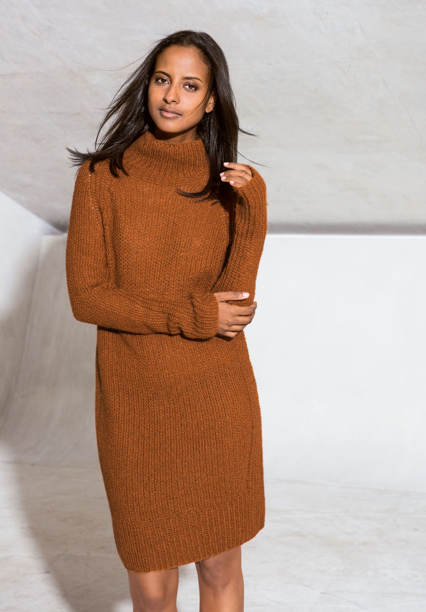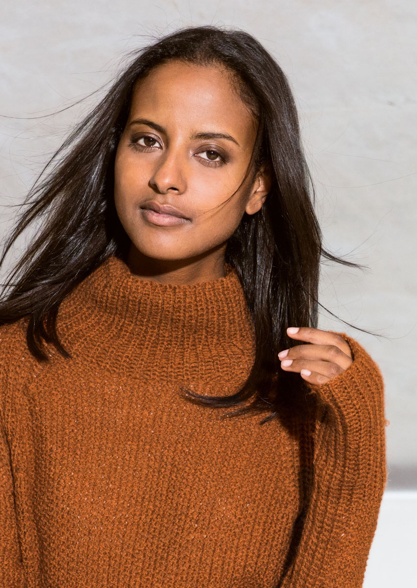 Lana Grossa Arioso (48 % Schurwolle, 30 % Alpaka, 22 % Polyamid, Lauflänge 240 m/50 g) 300 (350 – 400) g Terracottaorange (Fb 22); Stricknadeln Nr. 6 und 7; eine 40 cm lange Rundstricknadel Nr. 6.