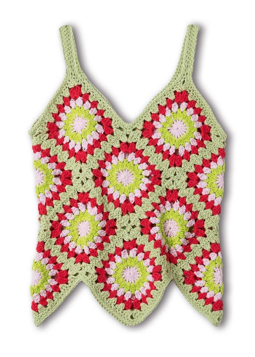 Lana Grossa Campo (65% Baumwolle, 25% Viskose, 10% Leinen; LL = 165 m/50 g): 50 (50/100) g Zartgrün (Fb. 10) und je 50 g Rosé (Fb. 21), Neongrün (Fb. 11) und Himbeer (Fb. 17); eine Häkelnadel 4 mm.