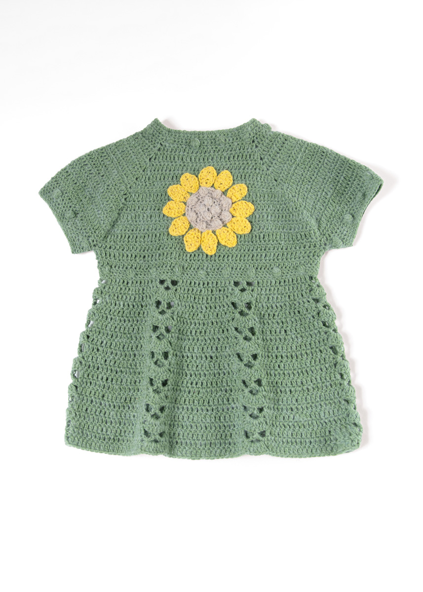 Lana Grossa Ecopuno (72% Baumwolle, 17% Schurwolle (Merino), 11% Alpaka (Baby); LL = 215 m/50 g): 100 (100/150/150) g Resedagrün (Fb. 20) und je 50 g Sandbeige (Fb. 64) und Gelb (Fb. 95); eine Häkelnadel 3,5 mm; Maschenmarkierer; 1 Holzknöpfen mit 10 mm Ø.