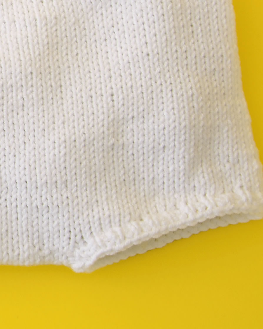 Lana Grossa Qualität „Elastico“, 96 % Baumwolle, 4 % Polyester, Lauflänge 160 m/50 g; ca. 150 (150/200) g Weiß (Fb 1); Stricknadeln Nr. 3,5, eine 40 cm lange Rundstricknadel Nr. 3,5, eine Häkelnadel Nr. 3; 1 Knopf und Gummiband.