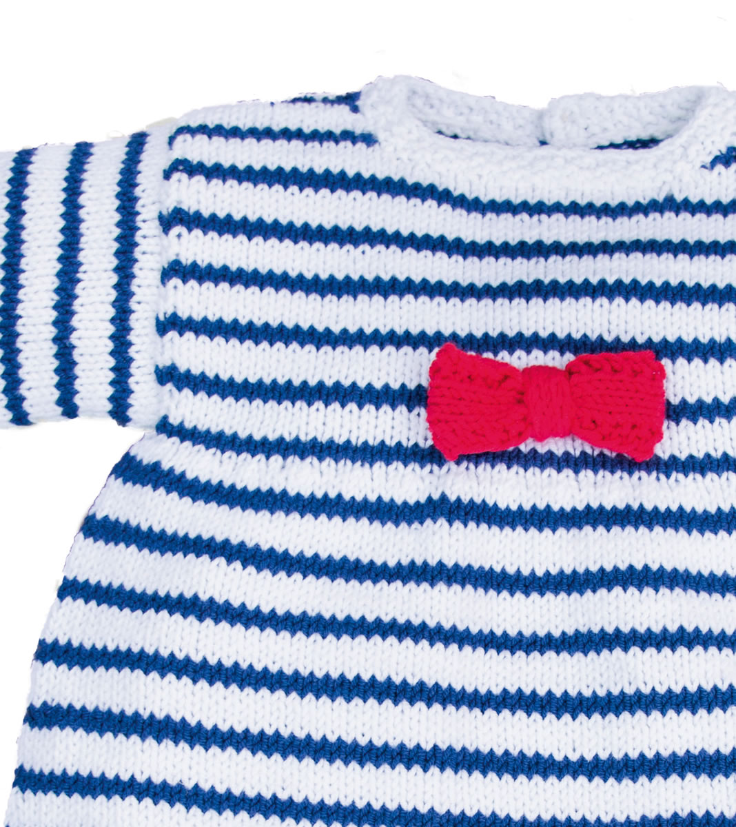 Lana Grossa Qualität „Elastico“, 96 % Baumwolle, 4 % Polyester, Lauflänge 160 m/50 g; je ca. 50 g Leuchtendrot (Fb 78) und Royal (Fb 114) und ca. 100 (100/150) g Weiß (Fb 1); Stricknadeln Nr. 3,5, eine 40 cm lange Rundstricknadel Nr. 3,5, Spielstricknadeln Nr. 3,5, eine Häkelnadel Nr. 3; 2 Knöpfe, ein Gummiband.
