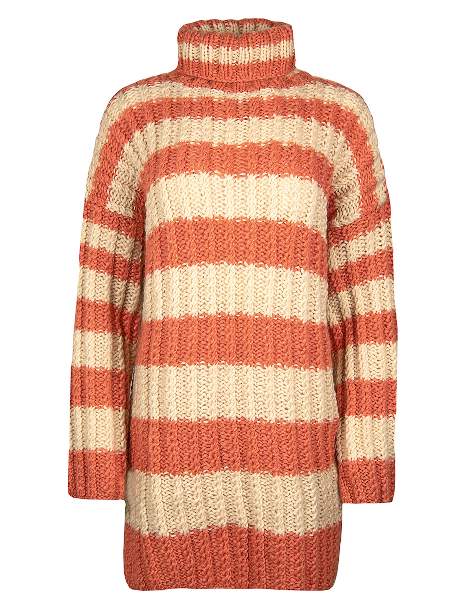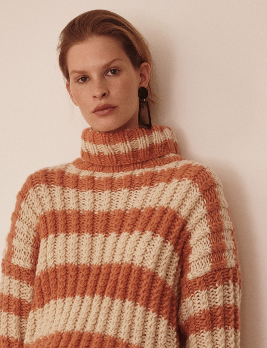 Lana Grossa-Qualität „Lala Berlin Lovely Cashmere“ (60 % Kaschmir, 25 % Polyamid, 15 % Schurwolle (Merino), Lauflänge 60 m/25 g): ca. 325 (350) g Lachs (Fb. 2) und Lana Grossa-Qualität „Lala Berlin Lovely Cotton“ (75 % Schurwolle (Merino superfine), 25 % Baumwolle, Lauflänge 90 m/50 g): ca. 300 (350) g Rohweiß (Fb. 7); Stricknadeln Nr. 8, 1 Rundstricknadel Nr. 7, 50 cm lang.