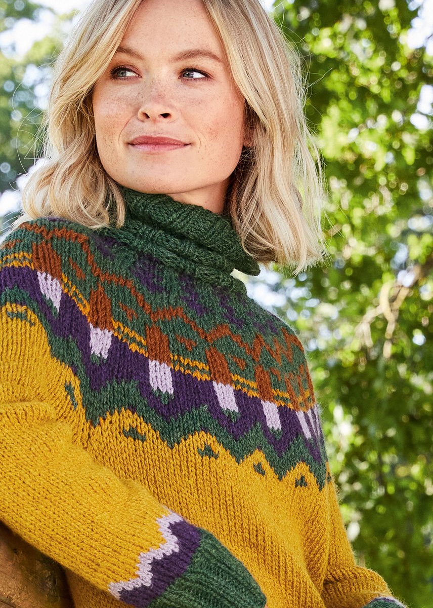 Lana Grossa-Qualität „Landlust Merino 120“ (94% Schurwolle Merino, 6% Polyamid (Trägerfaden), LL ca. 120 m/50 g), 400 (400) g Bernstein (Fb 139), 200 (250) g Tannengrün (Fb 143), 50 (100) g Aubergine (Fb 142), je 50 (50) g Haselbraun (Fb 140) und Flieder (Fb 137); je 1 Rundstricknadel Nr. 8, 40, 60 und 80 cm lang, 2 Maschenmarkierer.