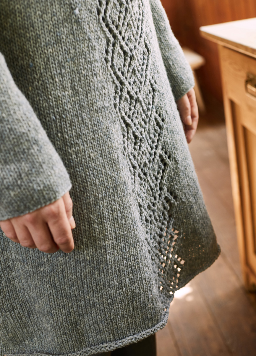 Lana Grossa-Qualität „Landlust Merino 180“ [94% Schurwolle (Merino), 6% Polyamid (Trägerfaden), LL ca. 180 m/50 g], 500 (550 – 550 – 600) g Blaugrau (Fb 225); Stricknadeln Nr. 5 und 5,5, eine 60 cm lange Rundstricknadel Nr. 5