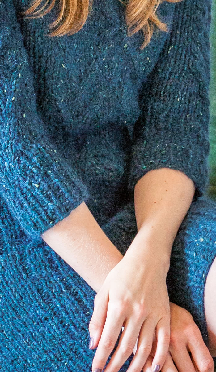 Lana Grossa „royal tweed” (100% Schurwolle, LL = 100 m/50 g) 350 g Schwarzgrün meliert (Fb 76) und „Silkhair Melange“ (70% Superkid, 30% Sei- de,LL=210m/25g)100g Marine meliert (Fb 716). Stricknadeln Nr. 8, eine Rundstricknadel Nr. 7.